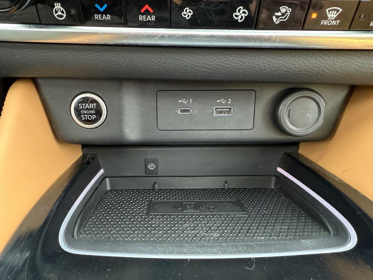 console au plancher pleine grandeur avec compartiment de rangement couvert. miniconsole au pavillon avec compartiment de rangement et 2 prises de courant de 12 v c.c.